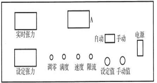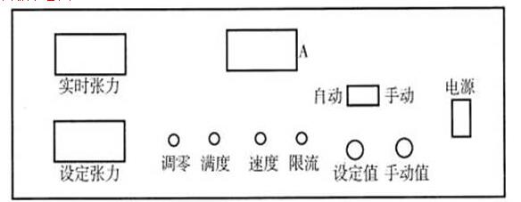 (1)“實時張力”顯示框: 數字顯示實時張力,顯示范圍0-100。 (2)“設定張力”顯示框: 數字顯示設定張力,顯示范圍0-100。 (3)“A” 電流顯示框: 數字顯示磁粉制動(離合)器的激磁電流,顯示范圍0-3A。 (4)“自動/手動” 按扭: 按扭在“自動”位置時,儀表進入自動控制狀態。按扭在“手動”位置時,通過“手動值”旋鈕,調整輸出激磁電流“A”的大小。 (5)“設定值” 旋鈕: 用于調整設定張力值。 (6)“手動值” 旋鈕: 用于“自動/手動”按扭在手動位置時調整輸出電流的大小按扭在“自動”位置時無效。 (7)“調零” 旋鈕: 用于調節實際張力的零位。 (8)“滿度” 旋鈕: 用于對實際張力進行靜態標定; (9)“速度” 旋鈕: 自動控制時改變張力反饋值的積分速度,使實時張力窗口讀數擺動最小,以提高控制精度。 (10)“限流” 旋鈕: 在張力自動控制狀態下,設定磁粉制動器或(離合器)工作時的最大激磁電流,該電流由系統所需最大張力確定。