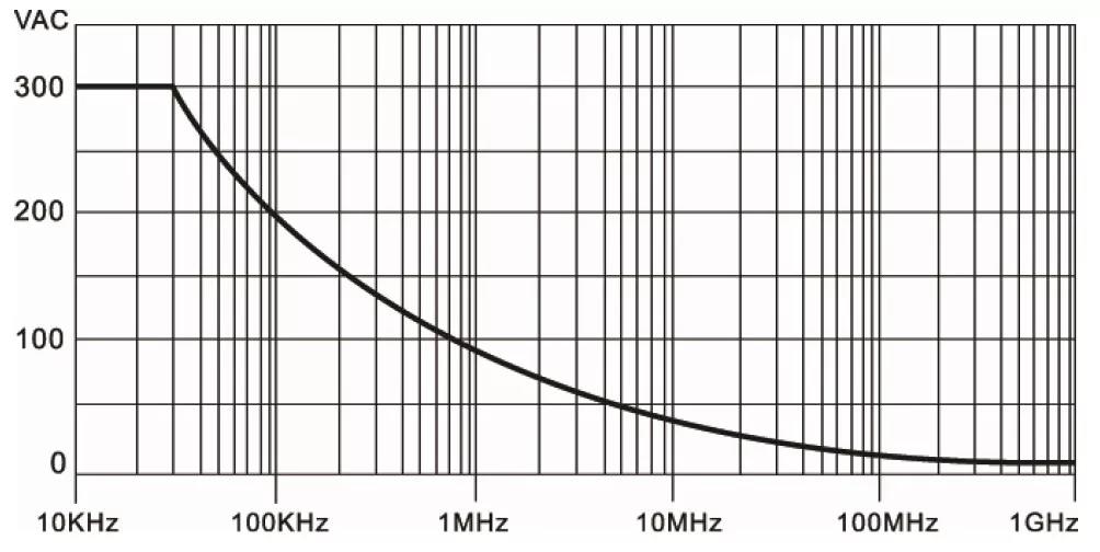 4、最大輸入電壓 最大輸入電壓是指探頭可以輸入的最大額定值的電壓。最大輸入電壓取決于探頭機身和探頭內部器件的額定擊穿電壓。一般該項會通過一些安規規范來給出,而不是給出單一的電壓,比如一般10×的無源探頭的最大輸入電壓為300VRMS CAT Ⅱ。其中CAT Ⅱ 指的是一類測試場景,300VRMS CAT Ⅱ指的是在這類測試場景下可以測量的最大電壓。而且這個電壓并不是一個恒定值。而是會隨著頻率的變化而變化。一般探頭會給出自己的電壓額定曲線,如下圖所示: