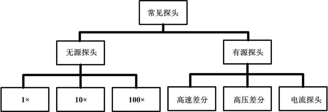 圖3 5、輸入電容 輸入電容就是從探頭的探頭頭部端測量出的電容。對于有源探頭,該電容包括探頭探針的寄生電容和探頭內部電路中的電容。對于一些無源探頭,還要包括探頭電纜的寄生電容和示波器本身的電容。該電容值越小,一般說明探頭可測量的頻率越高。 6、輸入電阻 探頭的輸入電阻是探頭的探頭頭部端測量出的電阻,該值是在DC情況下測量出來的。對于無源探頭來說,衰減比例越大,探頭的輸入電阻越高。 7、示波器補償范圍 多數無源探頭都是一種通用的設備,而在不同示波器之間,甚至在同一臺示波器不同通道之間都會有所差異。探頭為了兼容這些差異,就會自帶一個補償網絡,用來補償不同示波器間的差異。如果補償不足或者補償過度,就會導致測量結果出現錯誤。而這個補償網絡是一定會有一個能夠調整的范圍的,這個范圍就是示波器補償范圍。一般的無源探頭的示波器補償范圍為10~35pF。 8、電纜長度 每個探頭都必須有一段探頭電纜,這是為了更加方便的進行測量。而這段電纜會造成一定的信號傳播延時。例如,1m左右的探頭電纜,大概會有5ns的延時。對于10MHz的信號,這會造成大概20°左右的延時。電纜越長,會導致相位信號延遲越長。而這個延時一般情況下不會對測量造成影響,因為在一定帶寬范圍內,這個延時并不會跟隨信號頻率變化而變化,所以不會造成群延時的失真。只有在兩個以上通道一起測量時,傳輸延時才會產生影響,特別是當電壓探頭與電流探頭一起進行功率測量時,不同探頭之間的延時就會造成很大的影響。所以測量之前需要根據電纜長度來推算大致的延時。如果延時過大,則需要使用示波器內的延時校準功能。 常見探頭分類如下圖所示: