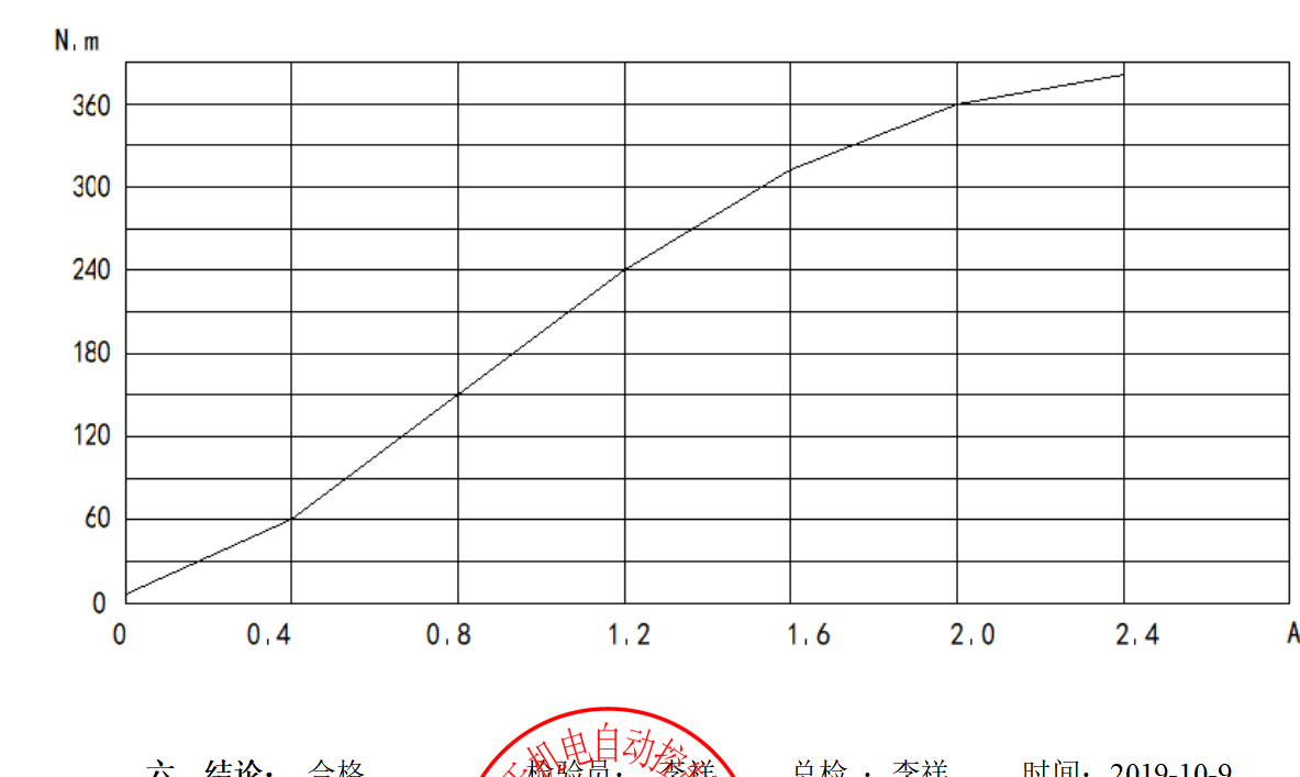 這是我公司200Nm磁粉制動器加載測試曲線圖,額定轉矩200Nm,2.4A對應加載轉矩381Nm,過載能力1.9倍。 那么磁粉制動器及磁粉離合器的發展應用有哪些呢,如果您感興趣請看下回介紹。 |